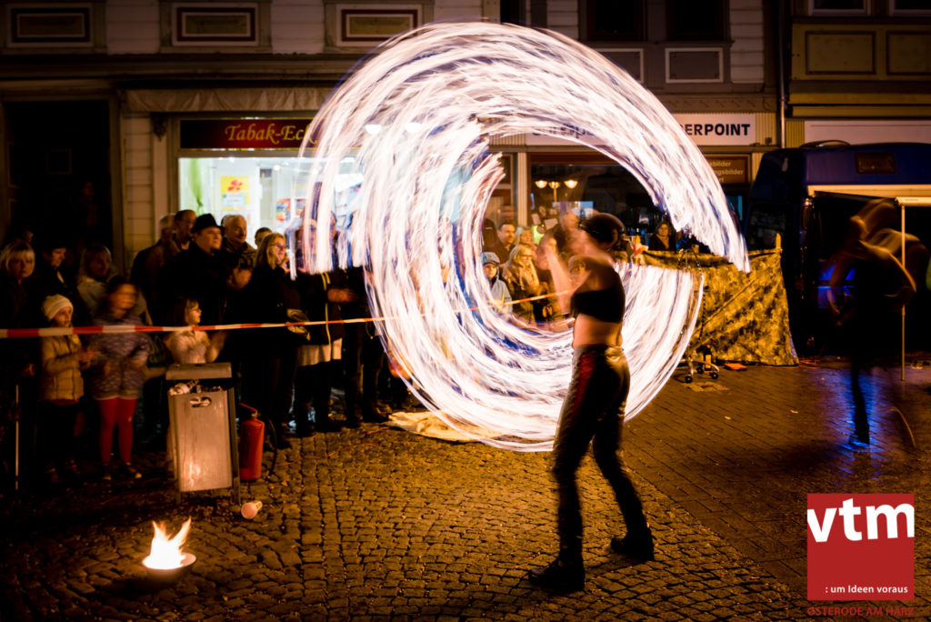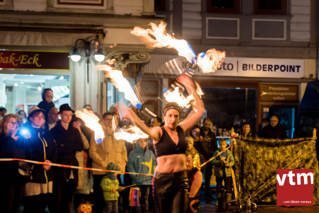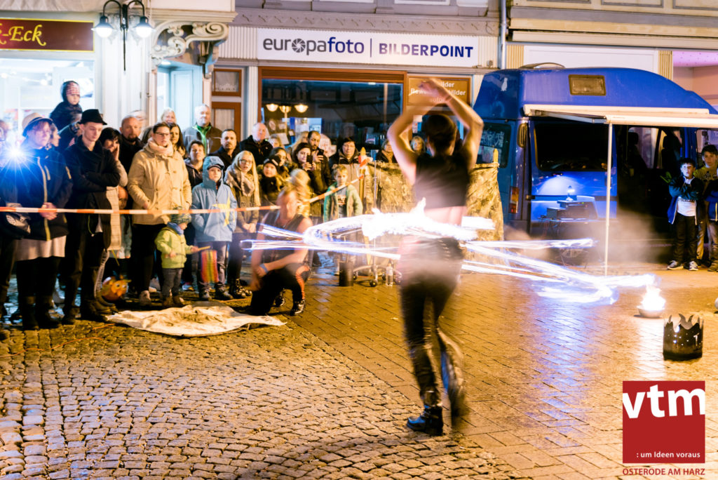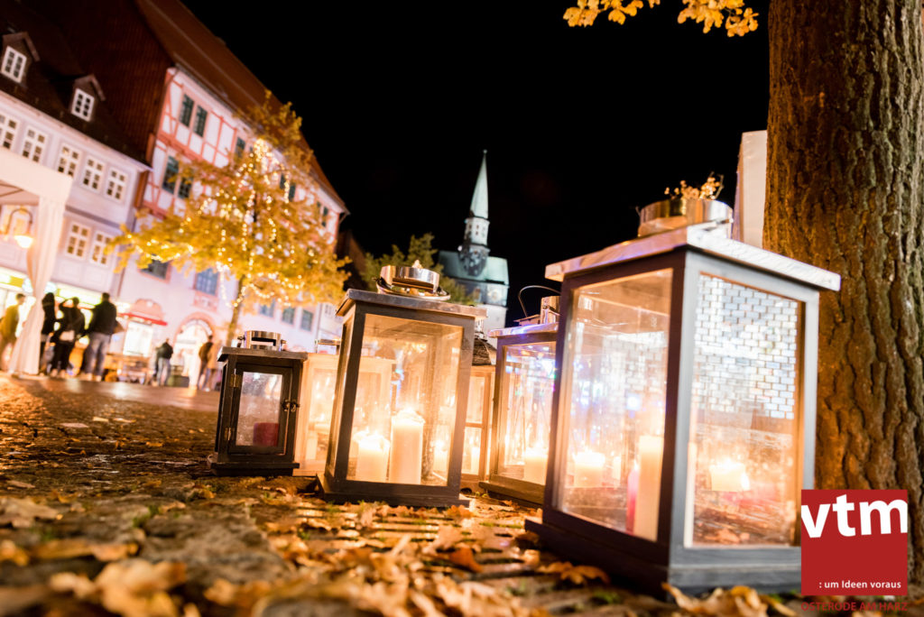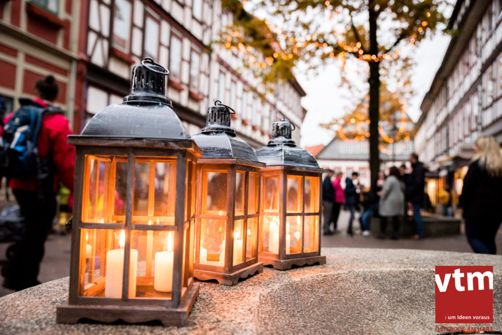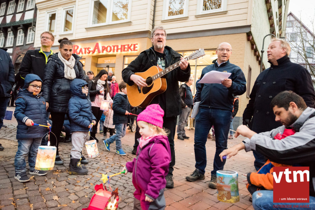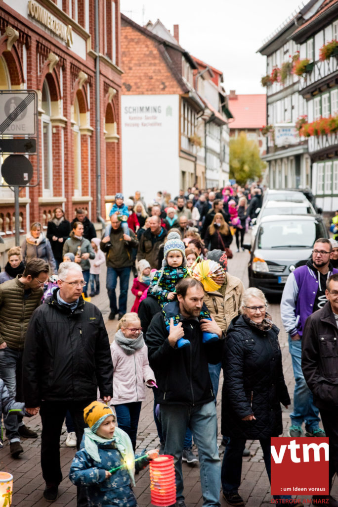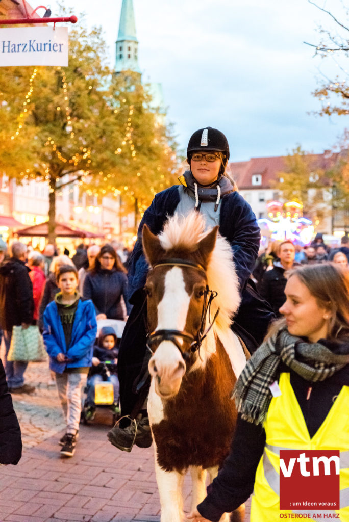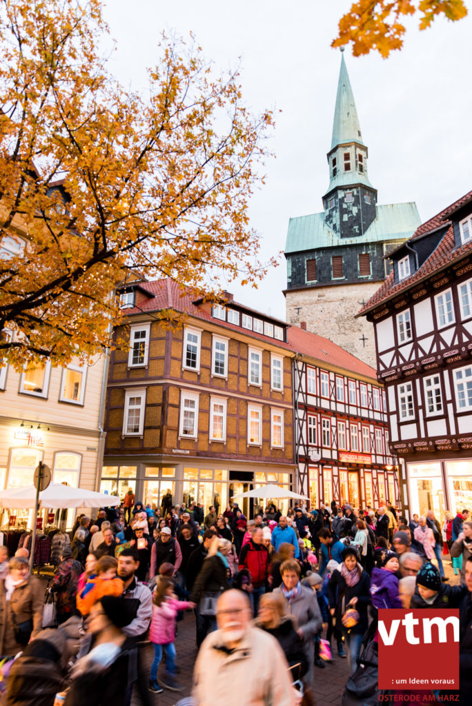 Voll, voller, am vollsten war die Osteroder Innenstadt am vergangenen Sonntag. Wir sind noch immer überwältigt davon, wie viele Besucher das Osteroder Lichterfest auf den Kornmarkt und drum herum gelockt hat. Jung und Alt bummelten im Schein der zahlreichen Lichter, stärkten sich mit den angebotenen Köstlichkeiten oder ließen sich von unserem Bürgermeister am vtm-Stand Glühwein einschenken. Strahlende Kinderaugen sah man im Kinderkarussell und Mini-Riesenrad sowie beim Kinderschminken von Optik Berneburg oder beim Laternebasteln im Spielzeugladen. Fast 100 Laternen sind am Sonntagnachmittag dort entstanden und fanden später ihren Einsatz beim Martinsumzug. Begleitet von Musiker Martin Hampe startete der Umzug um 16:30 Uhr auf dem Martin-Luther-Platz, auf dem man vor Kinderscharen und wunderschön leuchtenden Laternen kaum noch ein Bein auf den Boden bekam. Hoch zu Ross führte die Tochter des Bürgermeisters die bunte Laternen-Runde durch die Innenstadt bis zur Marientorstraße, wo die Kinder ein Heißgetränk sowie gesponserte Martinswecken vom Café Dornemann als Stärkung bekamen. Highlight des Tages und Abschluss einer gelungenen Veranstaltung bildete eine tolle Feuershow mit Musik auf dem Kornmarkt. Wir freuen uns über die durchweg positive Resonanz der Bürger, Osteroder Geschäftsleute und Budenbetreiber. Wir,als Veranstalter, waren ebenfalls mehr als zufrieden. Ein besonderer Dank gilt dem Café Dornemann, Optik Berneburg sowie Frau Kruse vom Spielzeugladen, Frau Lücke vom Findling und Frau Anke Pflaumbaum, Mutter von Maik Pflaumbaum/Telekomshop Marientorstraße, für die Unterstützung.