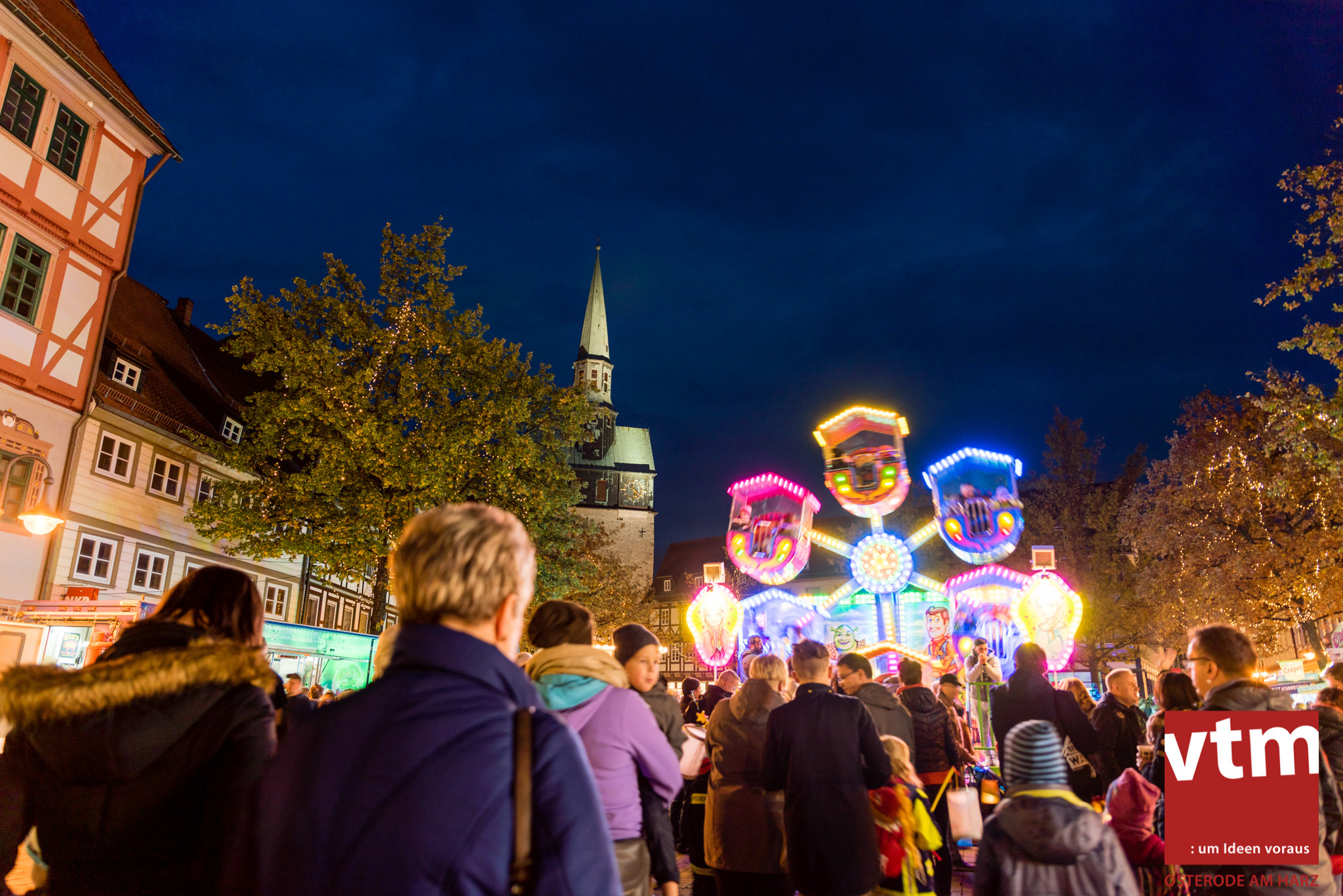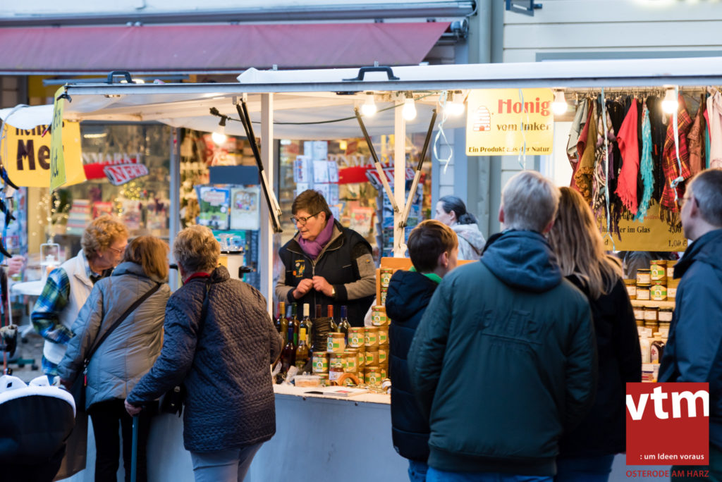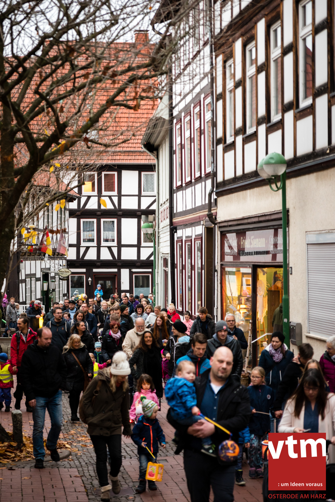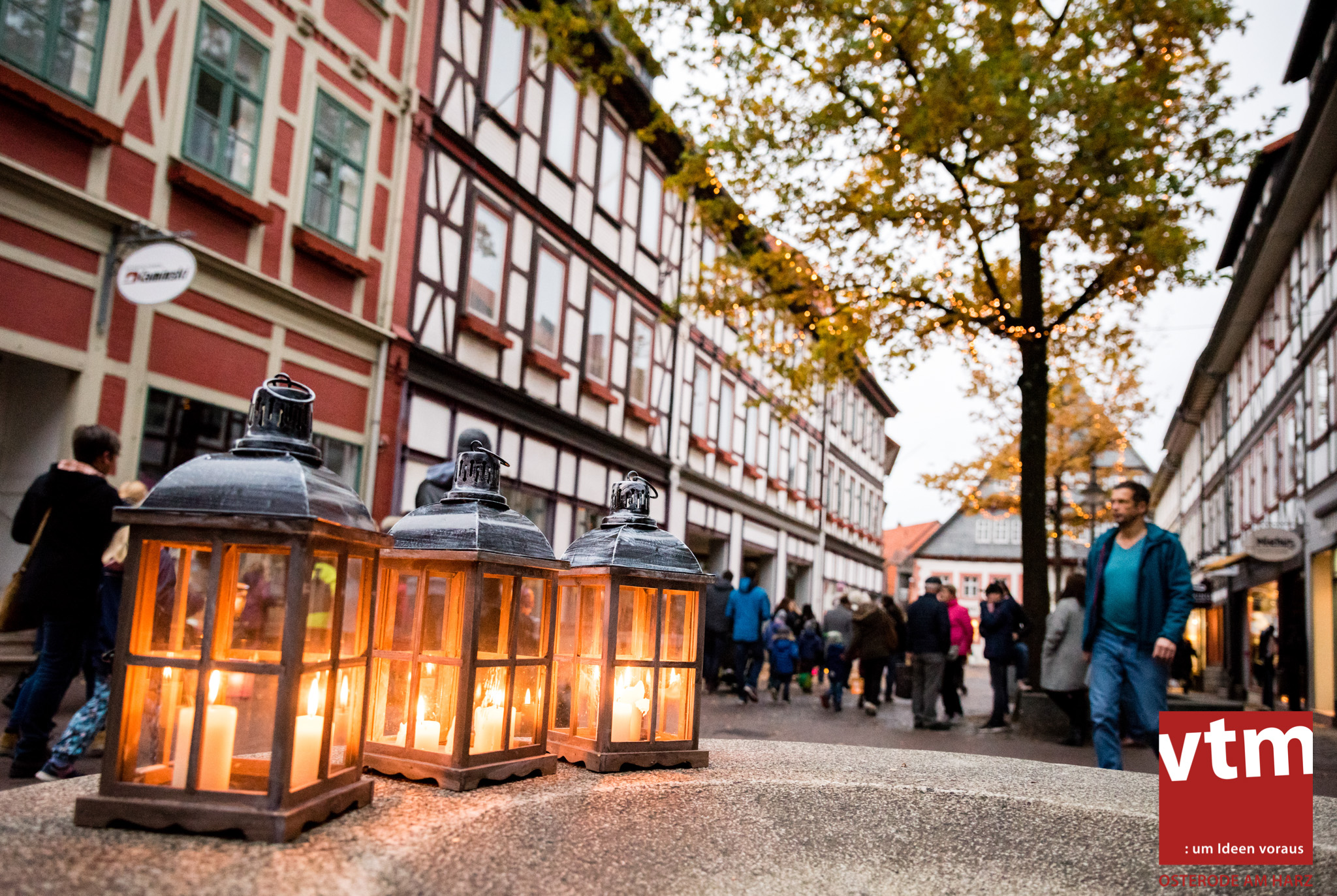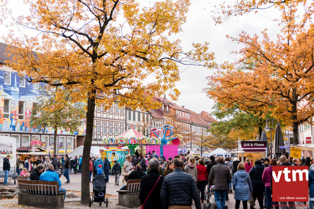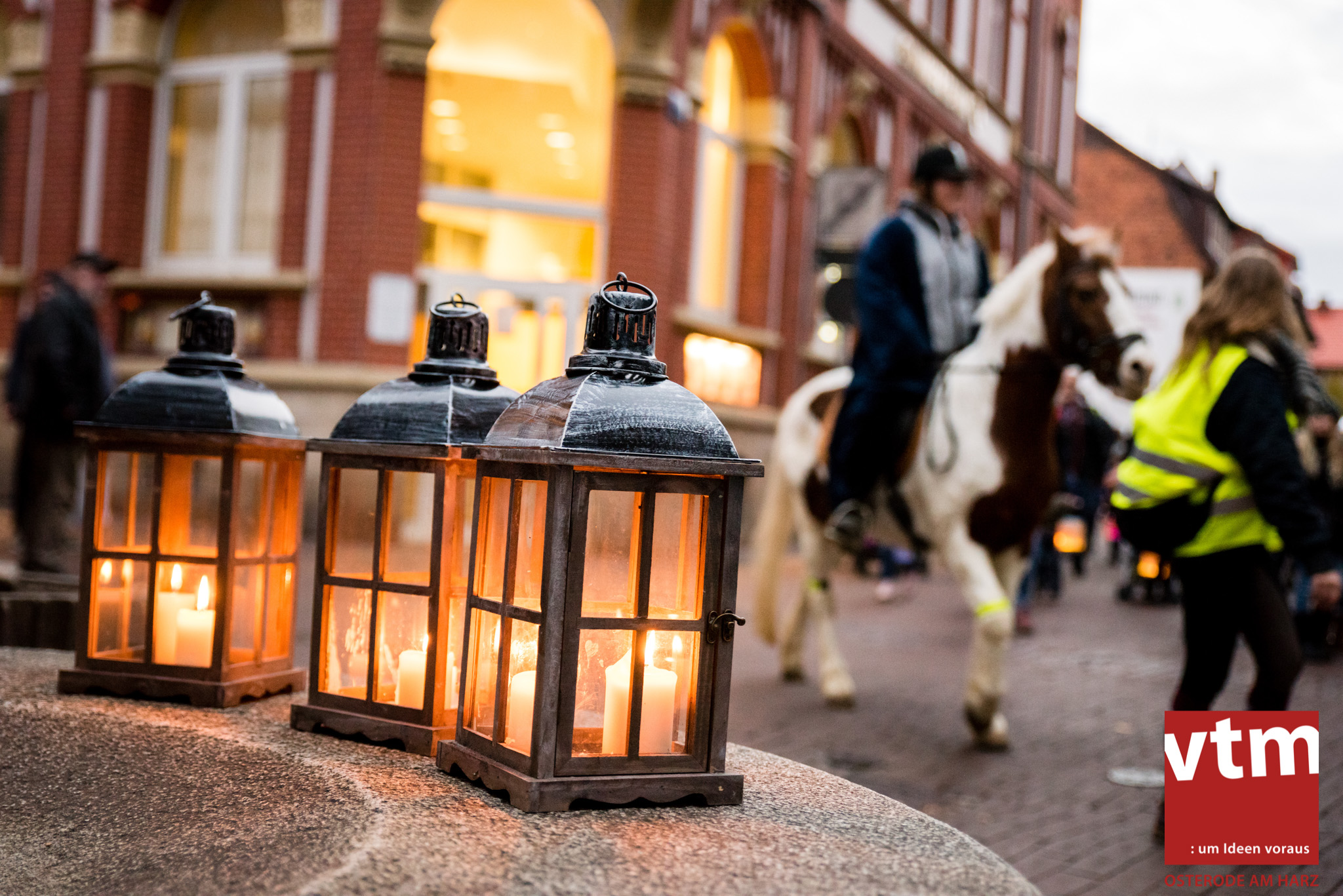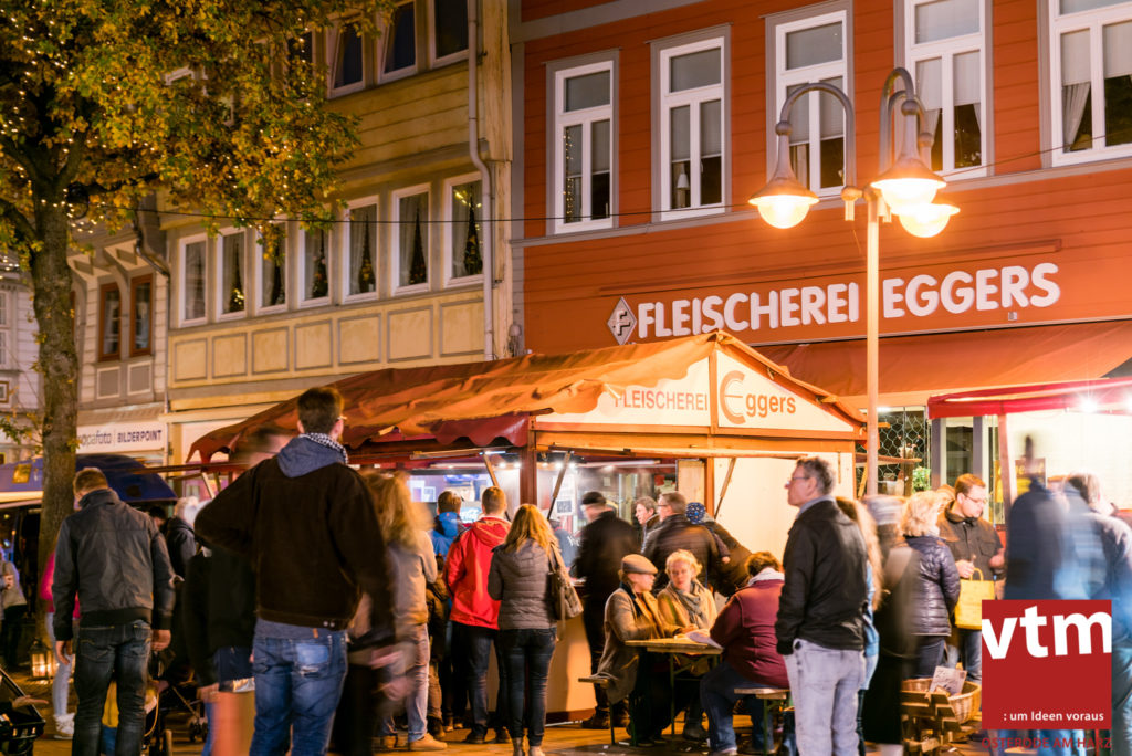 Voll, voller, am vollsten war die Osteroder Innenstadt am vergangenen Sonntag. Wir sind noch immer überwältigt davon, wie viele Besucher das Osteroder Lichterfest auf den Kornmarkt und drum herum gelockt hat. Jung und Alt bummelten im Schein der zahlreichen Lichter, stärkten sich mit den angebotenen Köstlichkeiten oder ließen sich von unserem Bürgermeister am vtm-Stand Glühwein einschenken. Strahlende Kinderaugen sah man im Kinderkarussell und Mini-Riesenrad sowie beim Kinderschminken von Optik Berneburg oder beim Laternebasteln im Spielzeugladen. Fast 100 Laternen sind am Sonntagnachmittag dort entstanden und fanden später ihren Einsatz beim Martinsumzug. Begleitet von Musiker Martin Hampe startete der Umzug um 16:30 Uhr auf dem Martin-Luther-Platz, auf dem man vor Kinderscharen und wunderschön leuchtenden Laternen kaum noch ein Bein auf den Boden bekam. Hoch zu Ross führte die Tochter des Bürgermeisters die bunte Laternen-Runde durch die Innenstadt bis zur Marientorstraße, wo die Kinder ein Heißgetränk sowie gesponserte Martinswecken vom Café Dornemann als Stärkung bekamen. Highlight des Tages und Abschluss einer gelungenen Veranstaltung bildete eine tolle Feuershow mit Musik auf dem Kornmarkt. Wir freuen uns über die durchweg positive Resonanz der Bürger, Osteroder Geschäftsleute und Budenbetreiber. Wir,als Veranstalter, waren ebenfalls mehr als zufrieden. Ein besonderer Dank gilt dem Café Dornemann, Optik Berneburg sowie Frau Kruse vom Spielzeugladen, Frau Lücke vom Findling und Frau Anke Pflaumbaum, Mutter von Maik Pflaumbaum/Telekomshop Marientorstraße, für die Unterstützung.