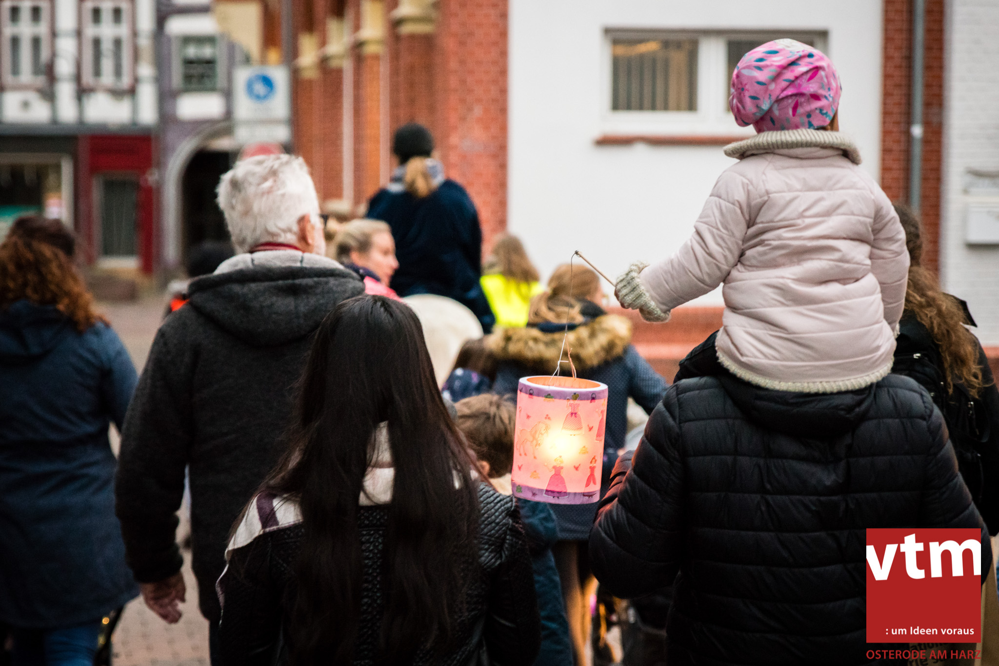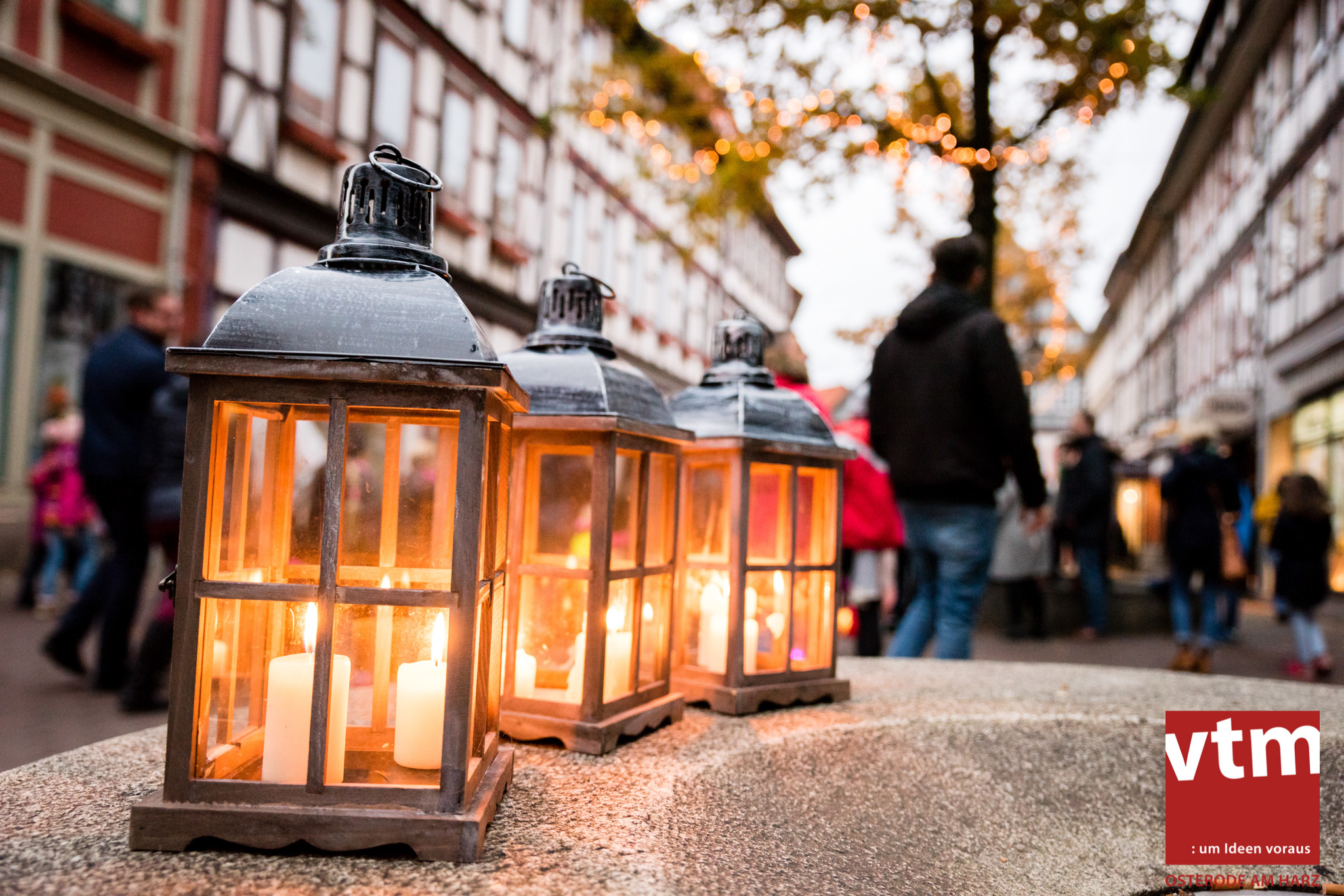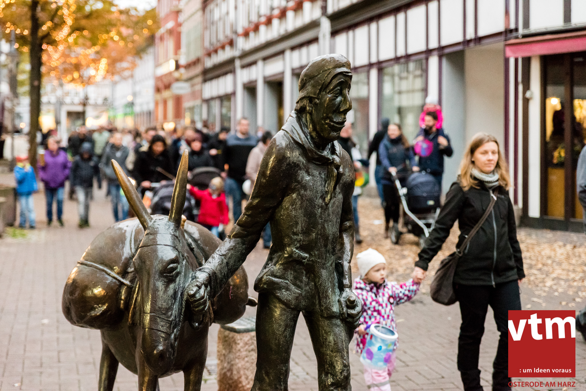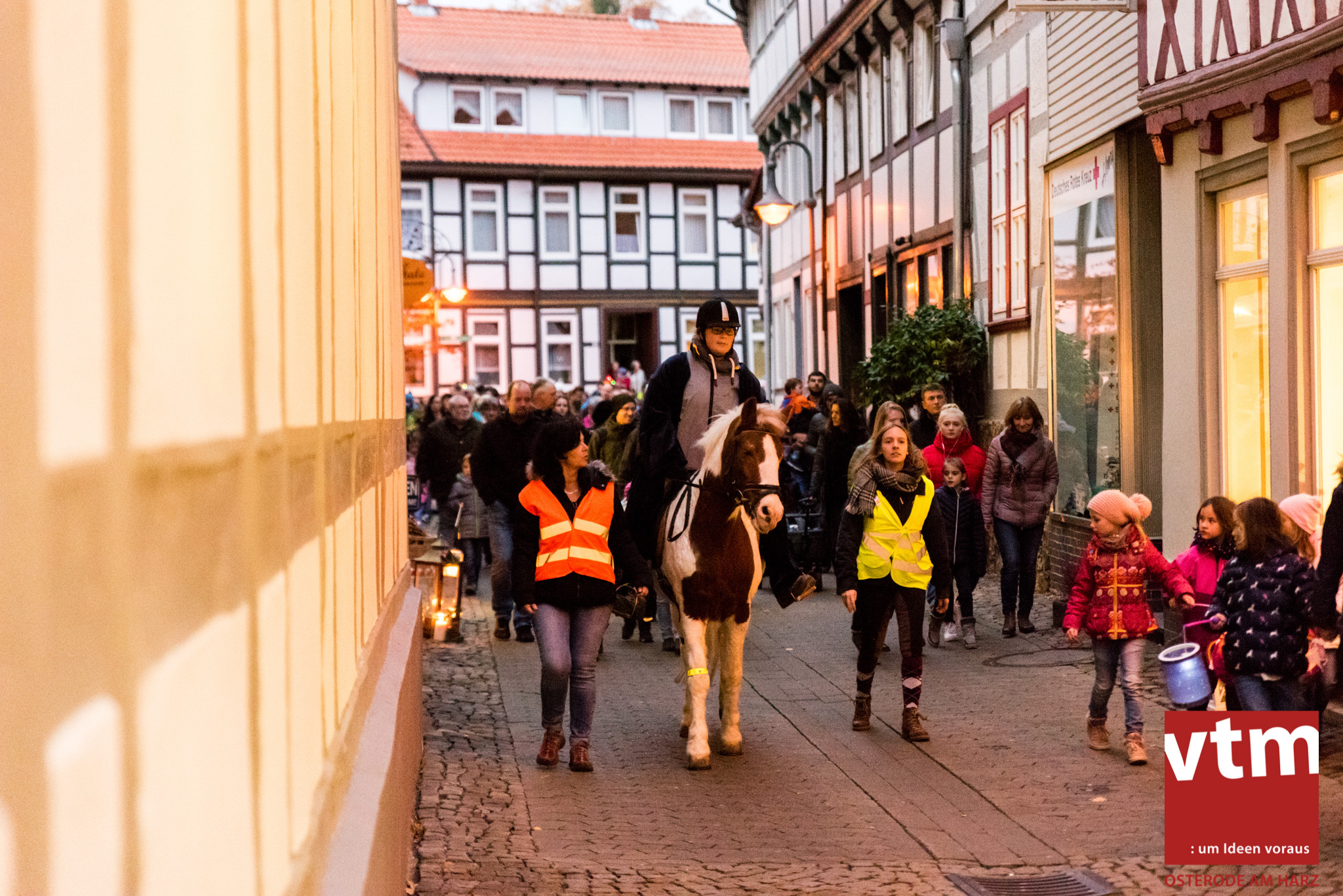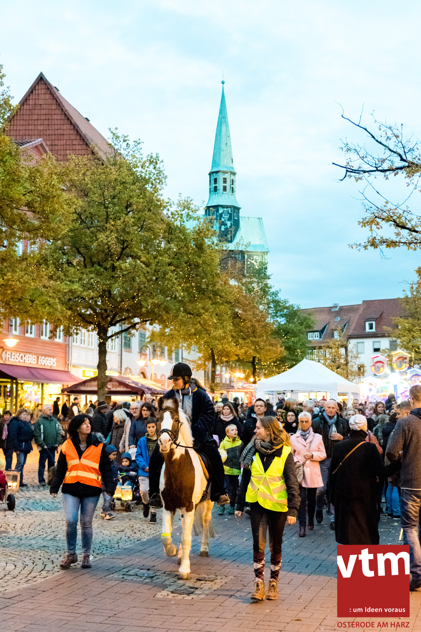 Voll, voller, am vollsten war die Osteroder Innenstadt am vergangenen Sonntag. Wir sind noch immer überwältigt davon, wie viele Besucher das Osteroder Lichterfest auf den Kornmarkt und drum herum gelockt hat. Jung und Alt bummelten im Schein der zahlreichen Lichter, stärkten sich mit den angebotenen Köstlichkeiten oder ließen sich von unserem Bürgermeister am vtm-Stand Glühwein einschenken. Strahlende Kinderaugen sah man im Kinderkarussell und Mini-Riesenrad sowie beim Kinderschminken von Optik Berneburg oder beim Laternebasteln im Spielzeugladen. Fast 100 Laternen sind am Sonntagnachmittag dort entstanden und fanden später ihren Einsatz beim Martinsumzug. Begleitet von Musiker Martin Hampe startete der Umzug um 16:30 Uhr auf dem Martin-Luther-Platz, auf dem man vor Kinderscharen und wunderschön leuchtenden Laternen kaum noch ein Bein auf den Boden bekam. Hoch zu Ross führte die Tochter des Bürgermeisters die bunte Laternen-Runde durch die Innenstadt bis zur Marientorstraße, wo die Kinder ein Heißgetränk sowie gesponserte Martinswecken vom Café Dornemann als Stärkung bekamen. Highlight des Tages und Abschluss einer gelungenen Veranstaltung bildete eine tolle Feuershow mit Musik auf dem Kornmarkt. Wir freuen uns über die durchweg positive Resonanz der Bürger, Osteroder Geschäftsleute und Budenbetreiber. Wir,als Veranstalter, waren ebenfalls mehr als zufrieden. Ein besonderer Dank gilt dem Café Dornemann, Optik Berneburg sowie Frau Kruse vom Spielzeugladen, Frau Lücke vom Findling und Frau Anke Pflaumbaum, Mutter von Maik Pflaumbaum/Telekomshop Marientorstraße, für die Unterstützung.