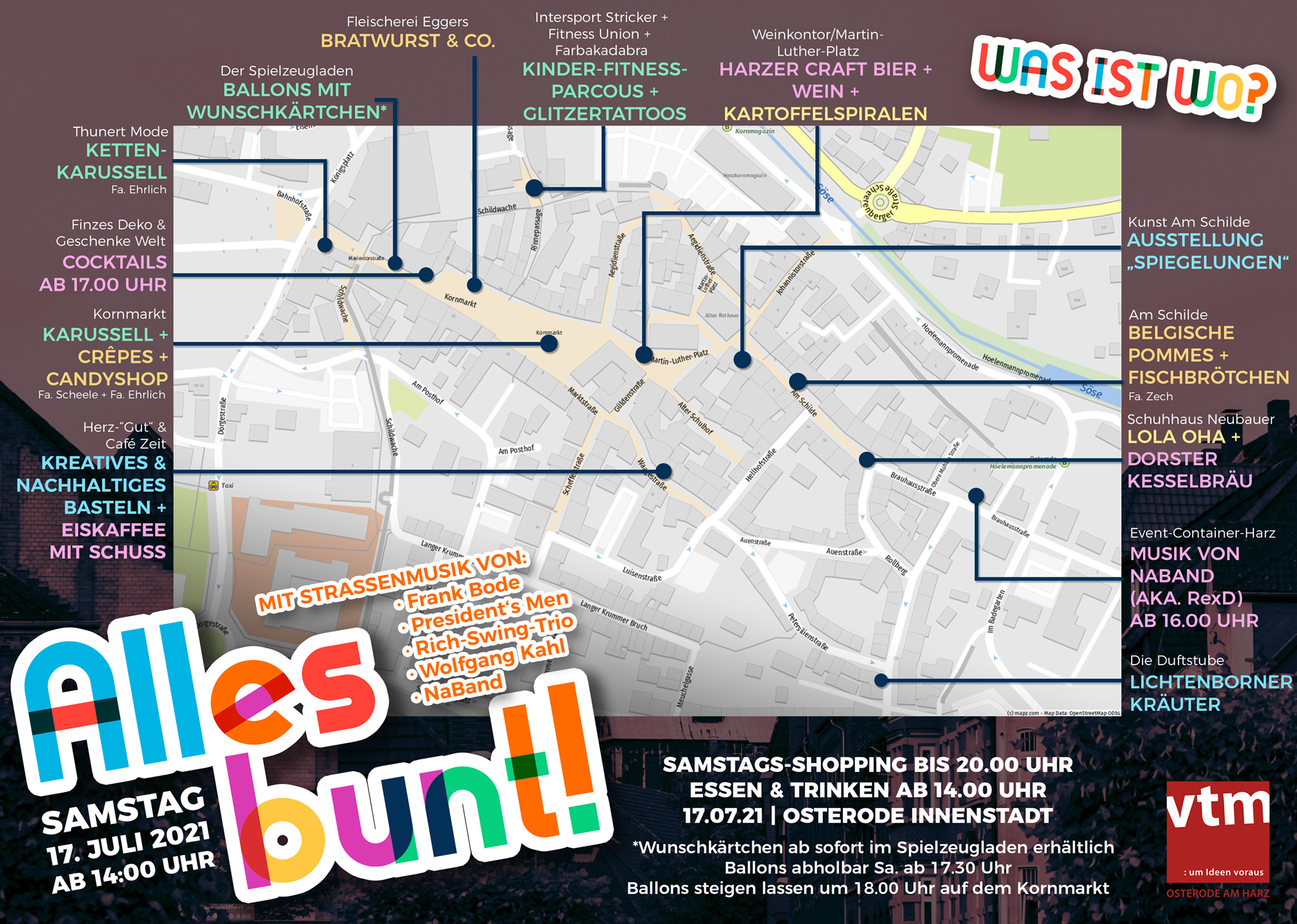 Am Samstag, den 17.07.2021 fand bei strahlendem Sonnenschein und sommerlichen Temperaturen unsere Veranstaltung „Alles bunt! – Langer Shopping-Samstag“ in der Osteroder Fußgängerzone statt. Hieran beteiligten sich der Großteil der inhabergeführten Geschäfte mit verlängerten Öffnungszeiten bis 20.00 Uhr, einige mit selbst geplanten Aktionen und Ständen vor ihren Türen.